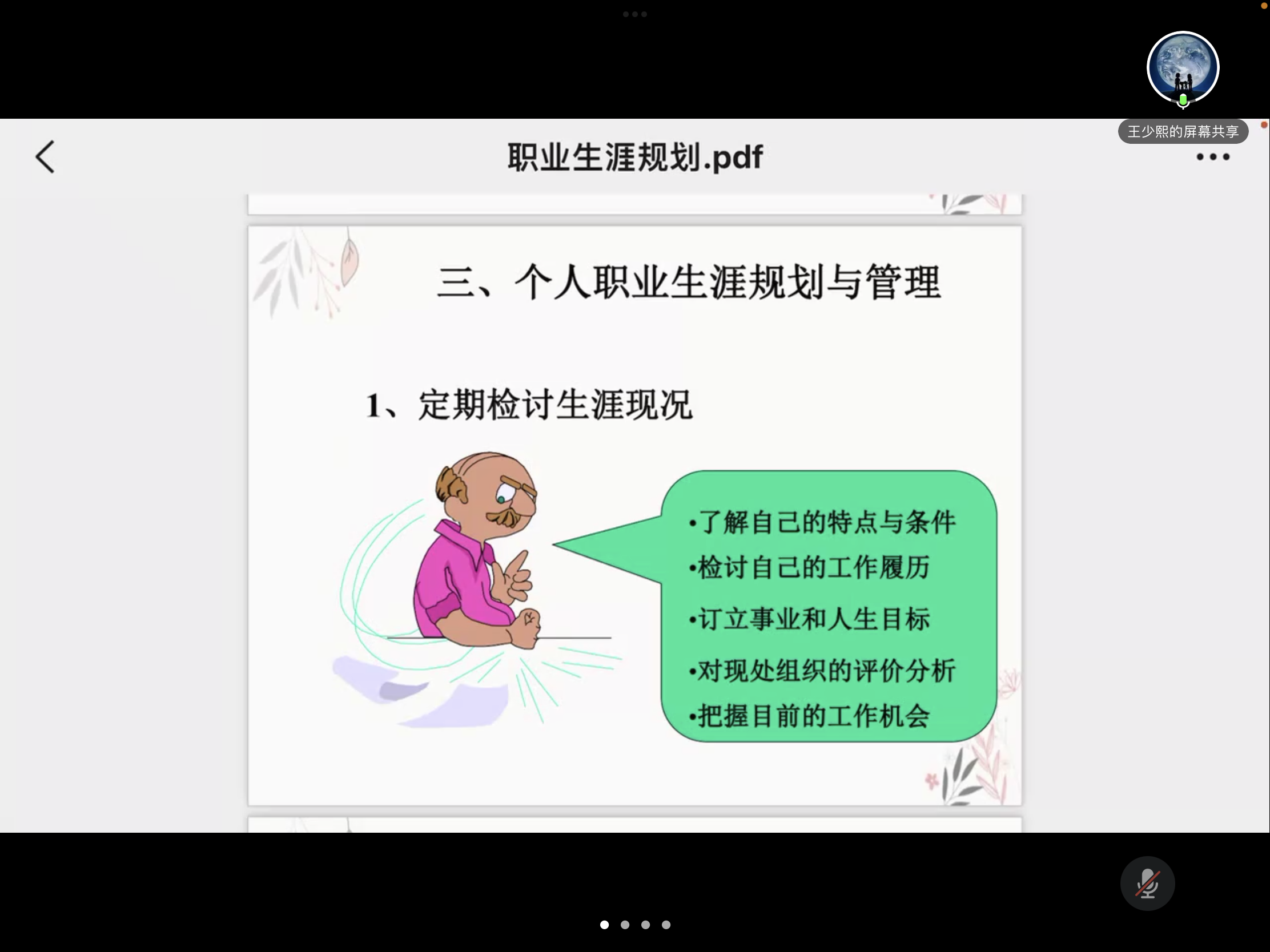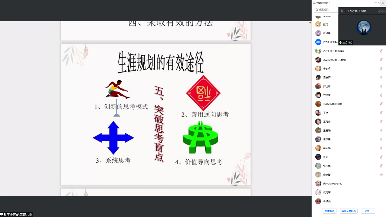 王少熙老师首先对即将进入社会,奔赴祖国各地参与工作的毕业生表示祝贺,祝贺毕业生们以优异的成绩从西北工业大学毕业,期待毕业生们在不久的将来能够成为有用之才,为社会主义现代化建设作出卓越的贡献。随后,王老师用他几十年的工作经验与人生阅历,在课上游刃有余地诠释出了职业发展教育的各个观点。王老师突出强调了个人职业生涯规划与管理需要做到定期检讨生涯现况、进行职业生涯相关训练、善于咨询,兼听则明与跨业学习,把握先机。王老师的讲解深入浅出,既为大四年级即将毕业的同学指明了职业发展的方向与方法,也给其他年级的同学带来了职业发展规划的教育与启示。