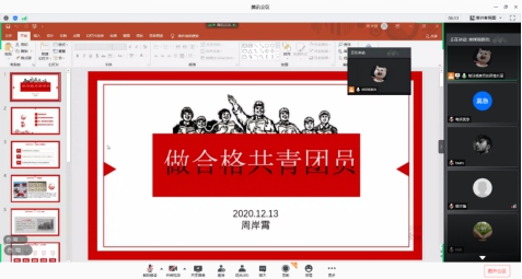 为深入学习贯彻习近平新时代中国特色社会主义思想,推进“两学一做”学习教育常态化制度化,2020年12月13日晚,太阳成集团tyc122ccvip2020级全体团支部通过线上会议对学生团员开展基本理论、基本知识以及优良传统的教育培训活动。本次活动由2020级大团支书周岸霄主持,学院团委书记、2020级学生辅导员汪钰成老师和2020级全体本科生参加。