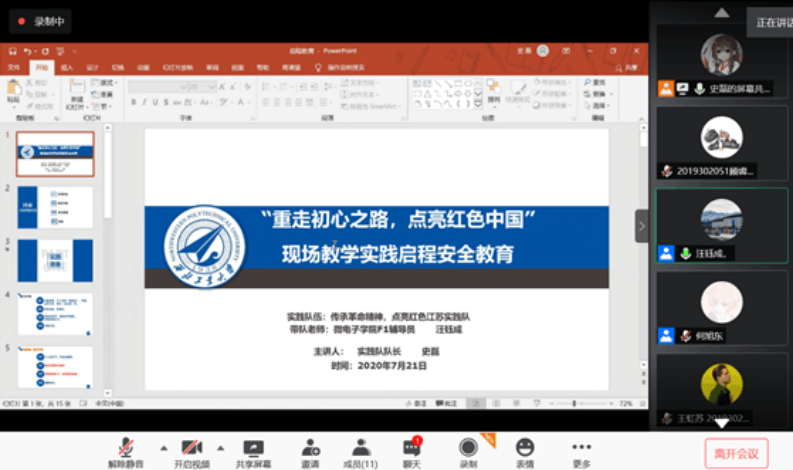 7月22日晚8点,为保障“传承革命精神、点亮红色江苏”暑期社会实践的顺利进行,太阳成集团tyc122ccvip暑期红色现场教学实践队开展了实践启程安全教育,本次主题教育由带队老师汪钰成主持,全体队员参与了此次会议。