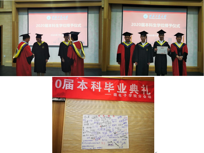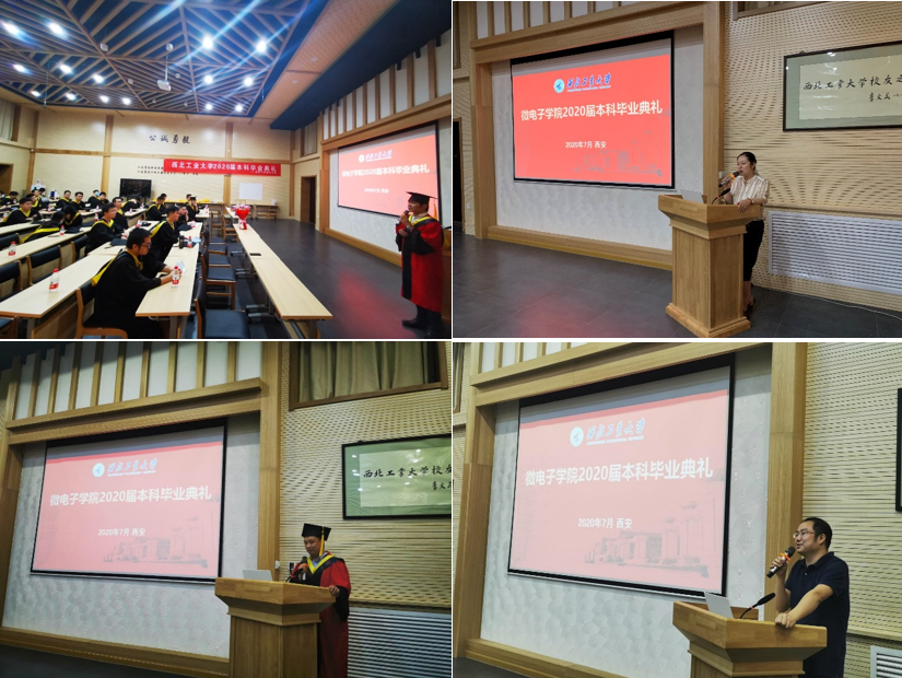 7月10日下午,西北工业大学太阳成集团tyc122ccvip2020届本科毕业典礼暨学位授予仪式在友谊校区阶二会议厅举行,祝贺全体微电子本科毕业生圆满完成学业任务,获得学士学位。学院副院长王少熙,党委副书记彭蓉,教师代表马彦昭、毕业班辅导员阴玥和全体本科毕业生参加毕业典礼,辅导员阴玥主持仪式现场。