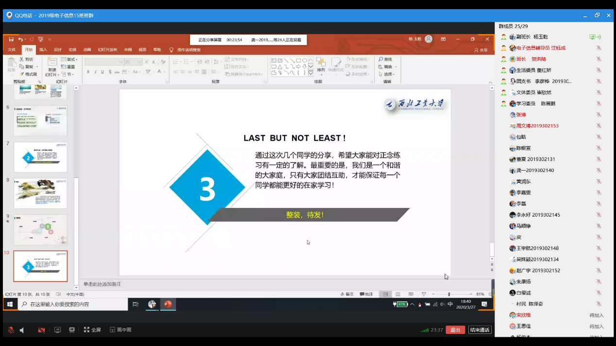 至此,本次线上心理班会圆满结束。会上每一名成员均积极参与发言,大家的凝聚力上升到前所未有的高度,相信大家一定能互帮互助,共渡这段特殊的时期。
