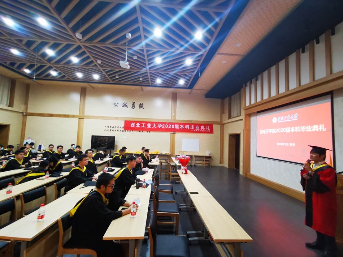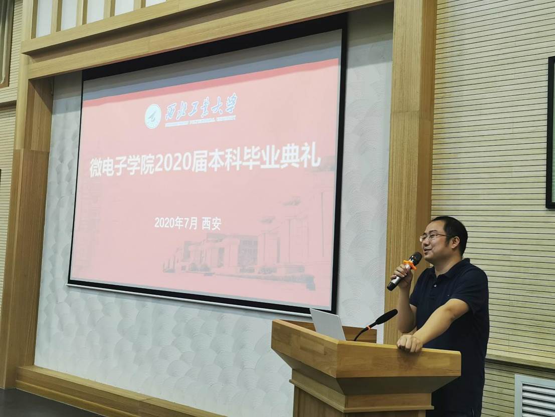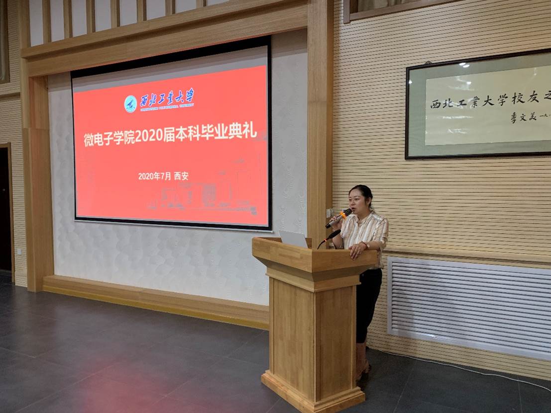 7月10日下午,西北工业大学太阳成集团tyc122ccvip2020届本科毕业典礼暨学位授予仪式在友谊校区阶二会议厅举行,祝贺全体微电子本科毕业生圆满完成学业任务,获得学士学位。学院副院长王少熙,党委副书记彭蓉,教师代表马彦昭、毕业班辅导员阴玥和全体本科毕业生参加毕业典礼,辅导员阴玥主持仪式现场。