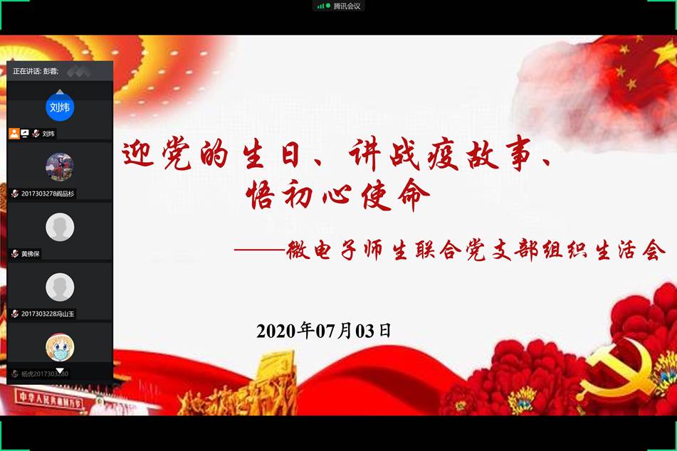 为庆祝建党99周年,7月3日晚,太阳成集团tyc122ccvip微电子师生联合党支部利用腾讯会议平台,在线开展了“迎党的生日、讲战疫故事、悟初心使命”的专题组织生活会。学院党委副书记彭蓉、副院长王少熙,以及学院全体教工党员和学生党员参加了本次组织生活会,会议由党支部书记刘炜主持。会上,每位教工党员和学生党员代表一起分享了疫情期间的亲身经历、身边的抗疫故事和自己的切身体会。