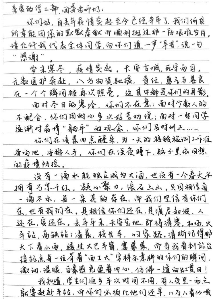 在抗疫这条道路上,你们付出了太多时间,太多精力,太多的心血。凌晨四点的西工大,你们醒来,为一天的核酸检测工作准备场地,安排人手;午夜十二点的西工大,你们终于睡去,却依旧挂念着校园疫情防控的方方面面。 面对冬日的寒冷,你们不在意;面对少数同学的不配合,你们用耐心去解释……核酸检测点蓝色遮阳棚下的“大白”是你们;宿舍楼下抗疫据点中的“红马甲”是你们;西工大学子归家路上的“西工大”示意牌依旧是你们。在风刀霜剑的相逼之下,你们永远坚强,薪火相传,美德不灭!