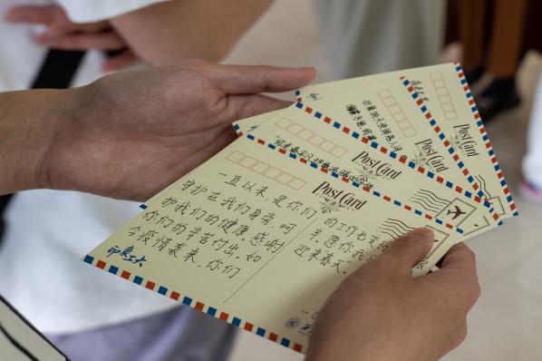 由于来访时仍处于工作时间,老师们在岗位上辛勤工作,同学们不约而同地放轻了脚步,将原本想向老师们表达的万语千言在嘴边浓缩成了一两句简单的感谢。收到明信片的老师们十分感动,与同学亲切交流。就是这样一场特别“安静”的感谢活动,体现出的却是师生双方“相互奔赴”,共同为疫情防控工作贡献自己的一份力量。仪式本身虽被简化,感激之情依旧浓厚。