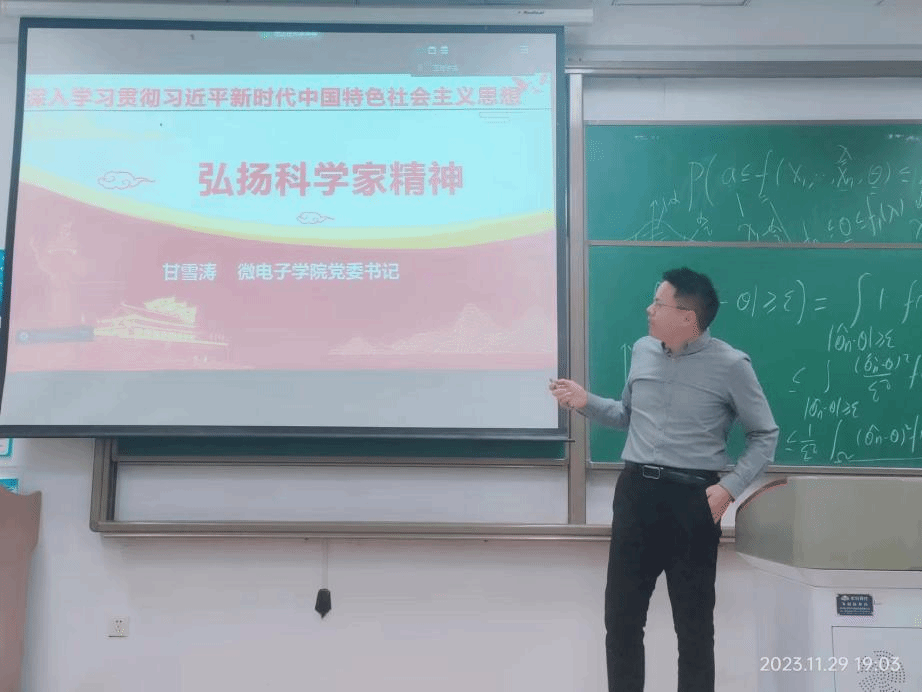 为深入学习贯彻习近平新时代中国特色社会主义思想,弘扬科学家精神,11月29日晚,太阳成集团tyc122ccvip党委书记甘雪涛在教学西楼B203为学院新发展的积极分子、发展对象及党支部书记、支部委员讲授“弘扬科学家精神”主题思政课。