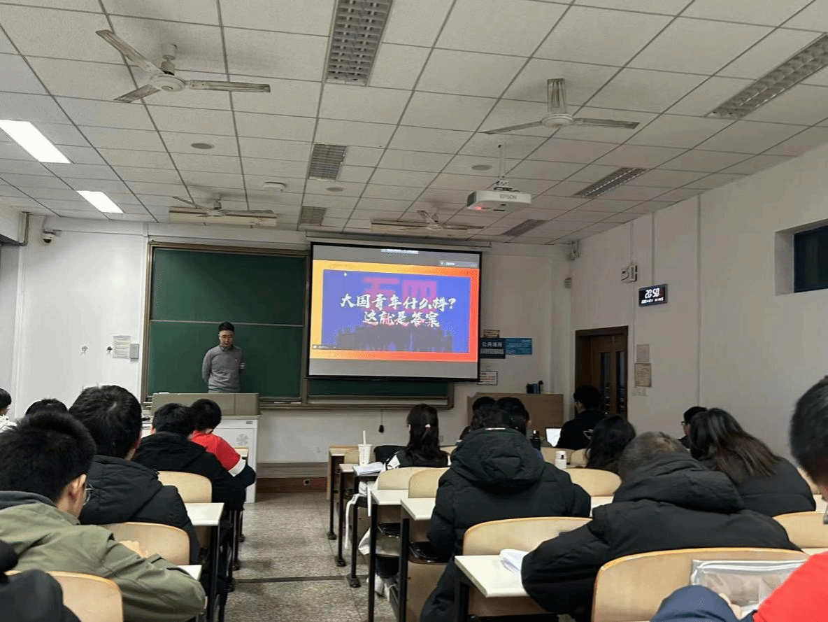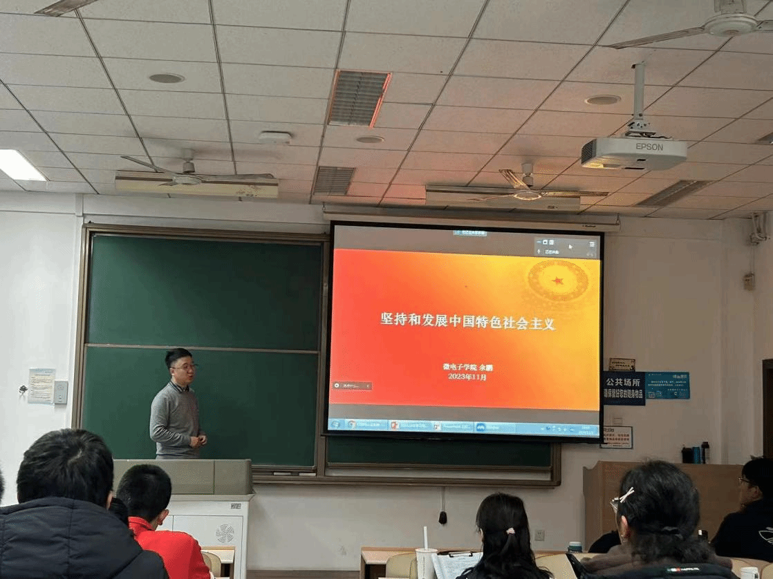 首先,余鹏从五个维度来阐述中国特色社会主义的发展历程,详细讲述了中国特色社会主义形成发展的四个阶段。向同学们生动阐释了中国特色社会主义不是一蹴而就的,是通过我们党和人民经过坚持不懈的实践积累得来的。随后,通过相关视频材料向同学们介绍了中国共产党带领全国人民探索中国特色社会主义所经历的艰难困苦和近百年来努力所取得的伟大成就。最后,结合十九大和二十大报告中关于教育、科技、人才的论述,对同学们提出了关于理想信念、素质修养、奋斗目标三个方面的建议,希望同学们能够向前辈们学习,严格要求自己,为国铸剑,为国创芯。