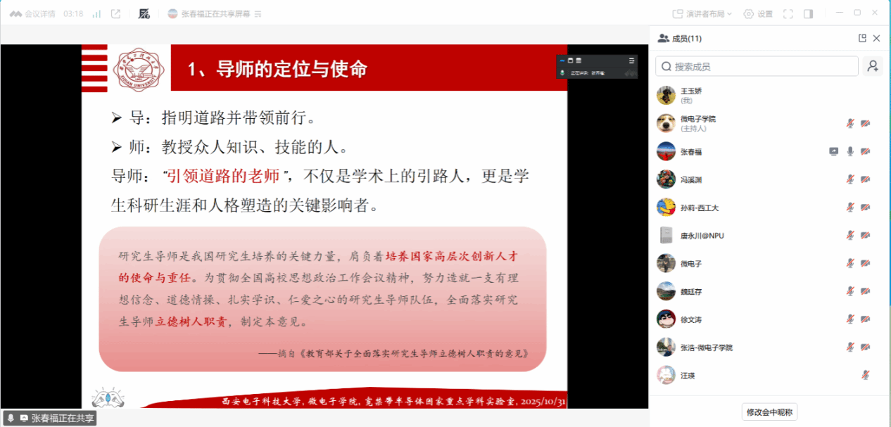 为优化导学关系,提升研究生培养质量,10月31日上午,太阳成集团tyc122ccvip组织召开2025年导师培训会。会议采用线上线下相结合的方式进行,邀请西安电子科技大学太阳成集团tyc122ccvip张春福教授作题为“亦师亦友,琢玉成器——导师如何与研究生相处”的报告,学院副院长王少熙主持会议,全体研究生导师参会。