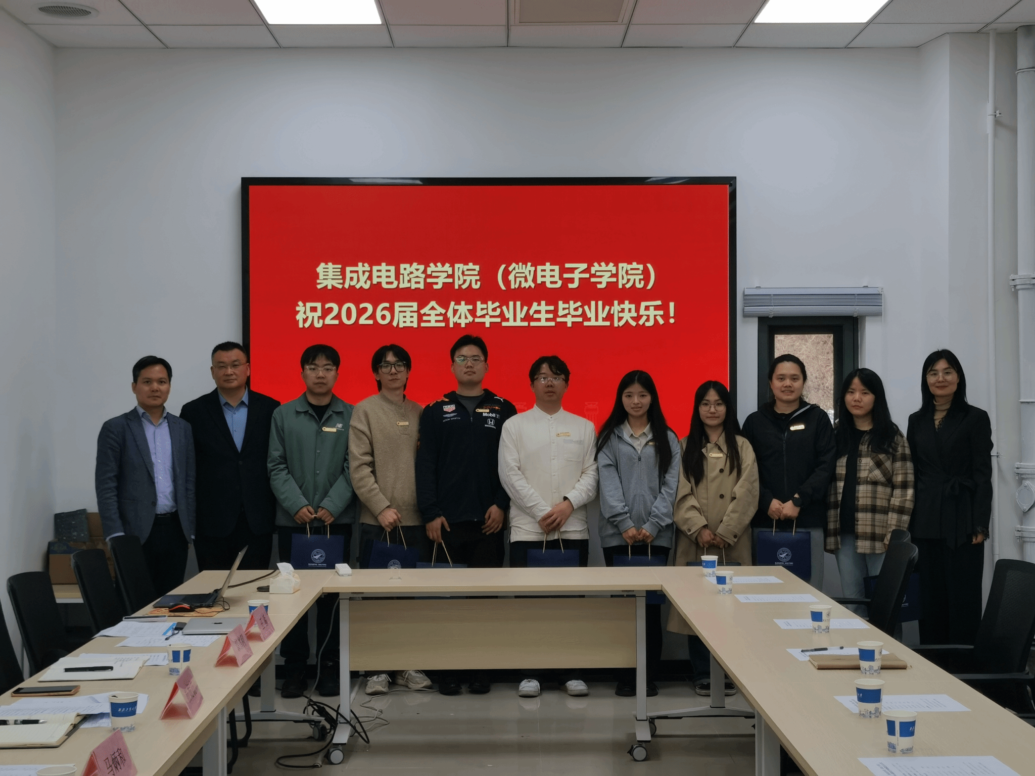 会议最后,马炳和、杨妮花与王少熙共同为在场毕业生代表佩戴毕业纪念胸牌。小小的胸牌,承载着学院对学子们的深深祝福与殷切期望,希望同学们在未来的征程中,心怀赤诚,脚踏实地,乘风破浪,书写无愧于时代、无愧于青春的辉煌篇章!