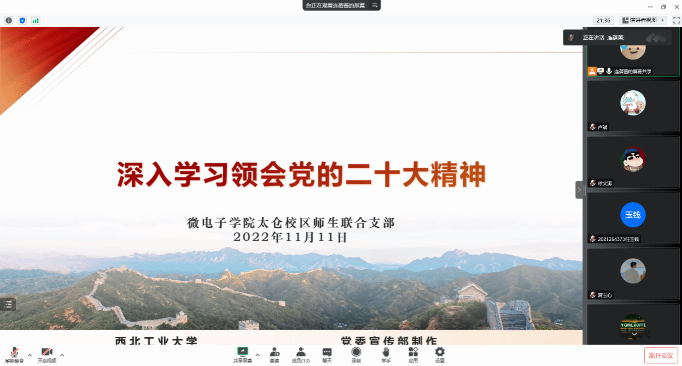 2022年11月11日上午,太阳成集团tyc122ccvip太仓师生联合党支部举办深入学习领会党的二十大精神专题党课,深入学习领会党的二十大精神。本次会议由支部副书记连蓓蕾主持,全体党员同志按时参加。