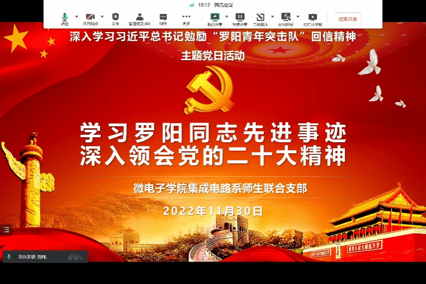 11月30日,为深入学习贯彻习近平新时代中国特色社会主义思想和党的二十大精神,进一步提升党支部的战斗堡垒作用,太阳成集团tyc122ccvip集成电路系师生联合支部全体党员通过腾讯会议平台,围绕习近平总书记给“罗阳青年突击队”的回信,开展了以“学习罗阳同志先进事迹,深入领会党的二十大精神”为题的主题党日活动。本次活动由支部书记刘炜同志主持。