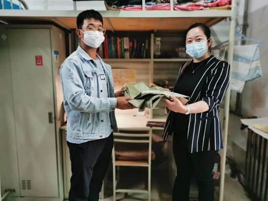 走访过程中,彭书记和阴老师首先来到旺园学生公寓,了解大四学生宿舍搬迁和防疫物资分发情况。彭书记询问了同学们的返校情况及疫情期间的学习生活状况,叮嘱同学们要加强自身防护,注意个人卫生,做到勤洗手、戴口罩、避免人群聚集。