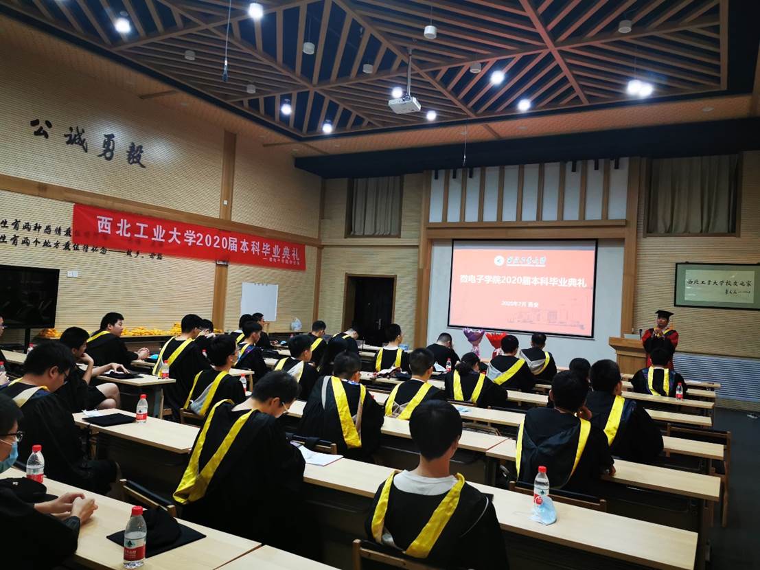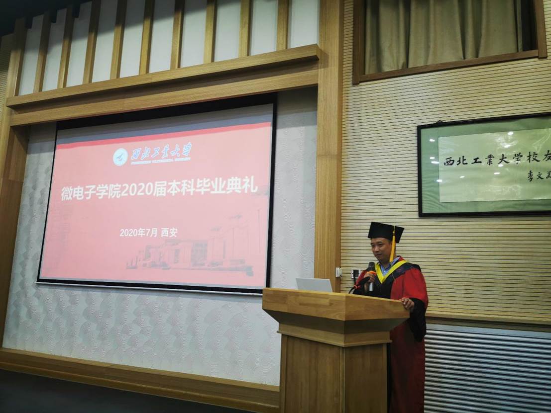 7月10日下午,西北工业大学太阳成集团tyc122ccvip2020届本科毕业典礼暨学位授予仪式在友谊校区阶二会议厅举行,祝贺全体微电子本科毕业生圆满完成学业任务,获得学士学位。学院副院长王少熙,党委副书记彭蓉,教师代表马彦昭、毕业班辅导员阴玥和全体本科毕业生参加毕业典礼,辅导员阴玥主持仪式现场。