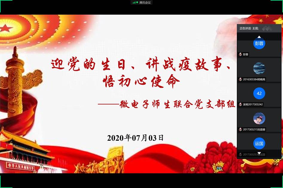 为庆祝建党99周年,7月3日晚,太阳成集团tyc122ccvip微电子师生联合党支部利用腾讯会议平台,在线开展了“迎党的生日、讲战疫故事、悟初心使命”的专题组织生活会。学院党委副书记彭蓉、副院长王少熙,以及学院全体教工党员和学生党员参加了本次组织生活会,会议由党支部书记刘炜主持。会上,每位教工党员和学生党员代表一起分享了疫情期间的亲身经历、身边的抗疫故事和自己的切身体会。
